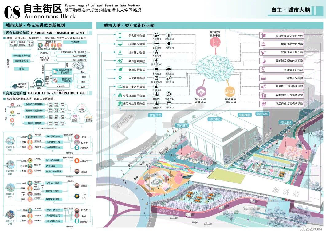 方案設計說明:本方案以基于數(shù)據(jù)實時反饋的自主街區(qū)為主題,通過構建自主交通、自主活力和自主城市大腦三大系統(tǒng),引入膠囊巴士、交通管理系統(tǒng)、智能可變鋪裝、智能活力細胞、底層分時開放、城市大腦和信息共享平臺,以提升該地區(qū)的空間活力;系統(tǒng)的運轉基于場地的時空需求進行實時調(diào)整,進行可持續(xù)的漸進式更新。