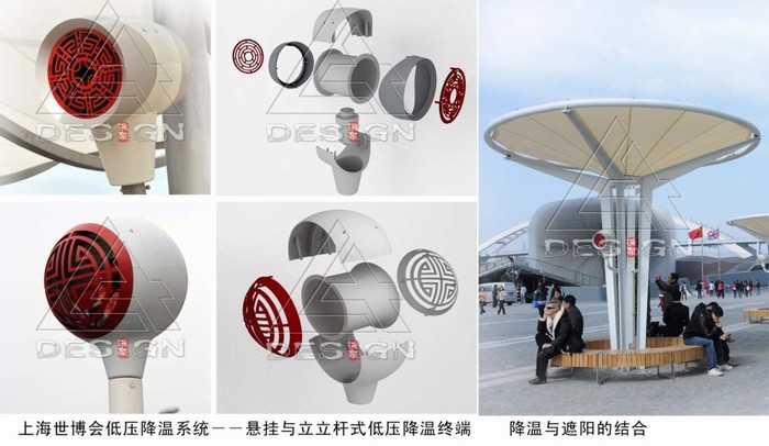 依據(jù)人體舒適度模型以及實驗表明,霧噴降溫設備宜結合遮陽設施布置降溫效果明顯好于太陽直射下的場地降溫效果。而世博場地降溫系統(tǒng)設計采用了“低壓兩相流噴霧降溫系統(tǒng)”,霧噴降溫設備根據(jù)水霧蒸發(fā)吸熱的原理,以水為原料,利用設備壓力,使水通過微孔撞擊霧化,形成自然水霧,以達到降低局部空間的環(huán)境溫度的效果。由于結合風力輸送,低壓兩相流霧噴技術相比高壓霧噴技術,具備影響人體舒適度因子中除了“溫度、濕度”外,增加了“風速”這一因子,故而,基于人體舒適度的“降溫”效果是更顯著的。